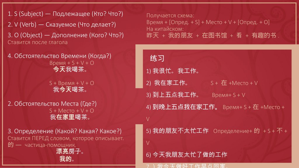 1. S (Subject) — Подлежащее (Кто? Что?)3. O (Object) — Дополнение (Кого? Что?)