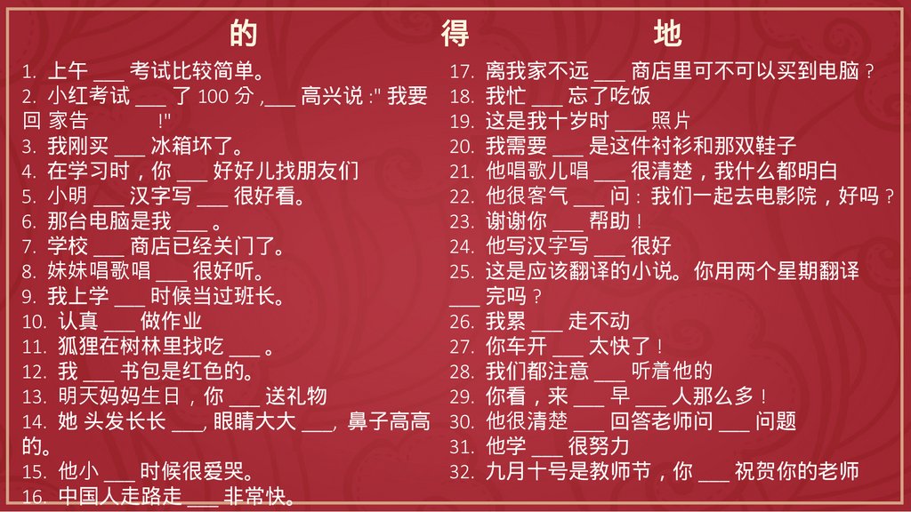 8. 请慢慢 ______________________ 说。 ( 的 \ 得 \ 地 )