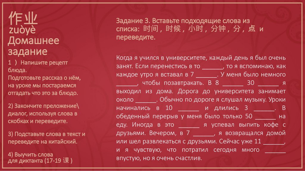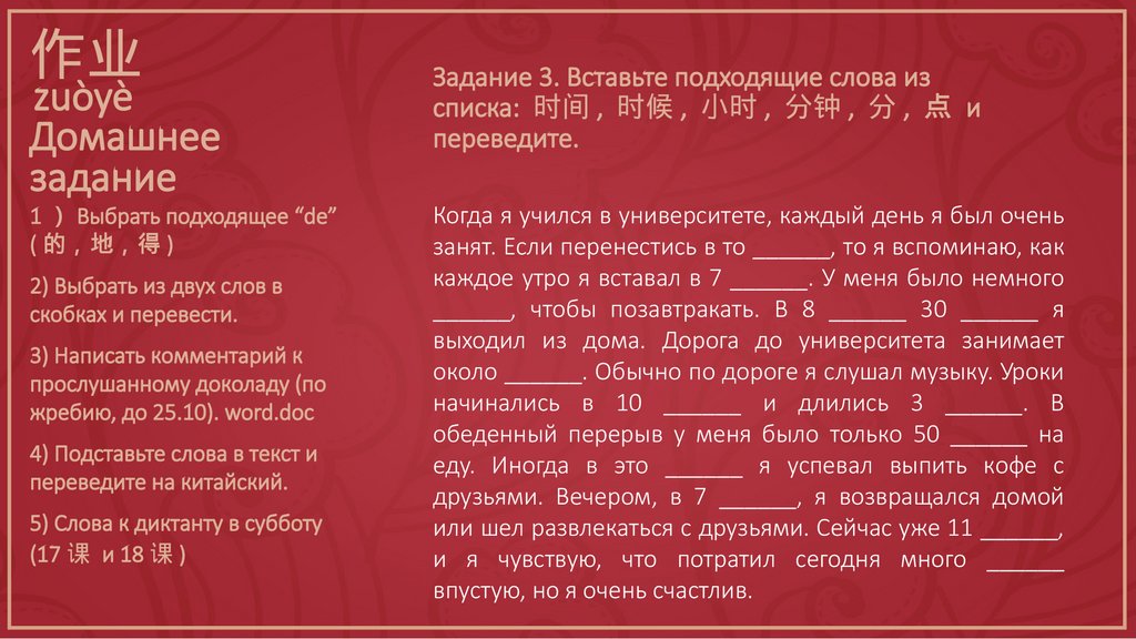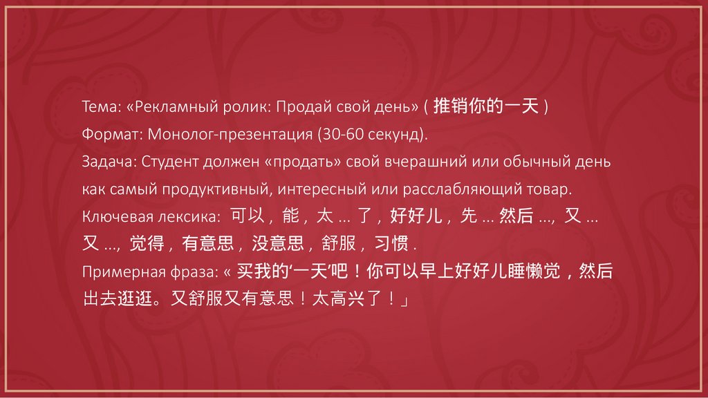 Тема: «Рекламный ролик: Продай свой день» ( 推销你的一天 )Формат: Монолог-презентация (30-60 секунд).