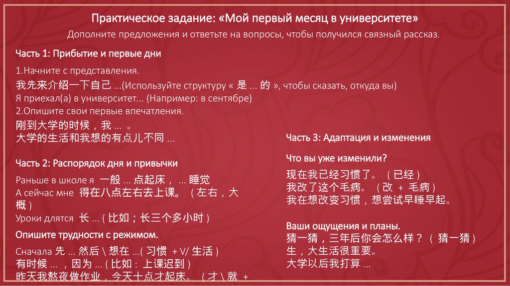 Практическое задание: «Мой первый месяц в университете»Дополните предложения и ответьте на вопросы, чтобы получился связный рассказ.