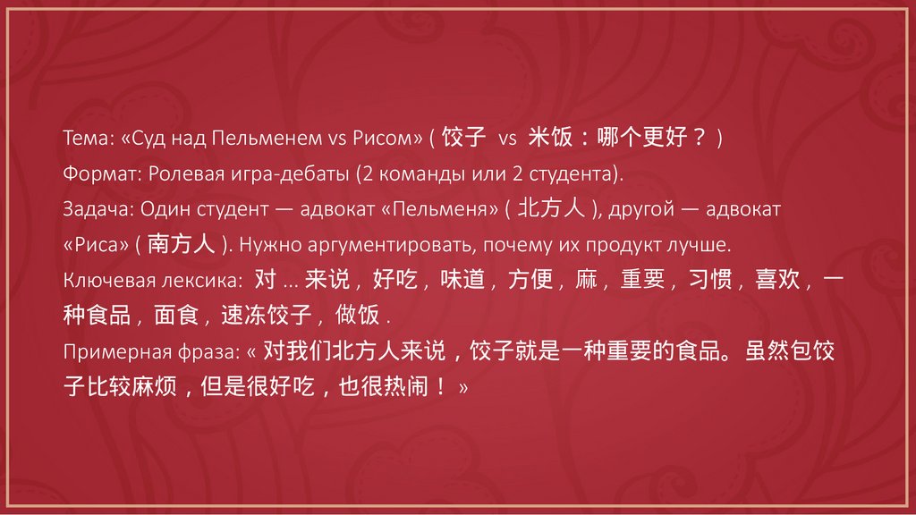 Тема: «Суд над Пельменем vs Рисом» ( 饺子 vs 米饭 哪个更好 )Формат: Ролевая игра-дебаты (2 команды или 2 студента).
