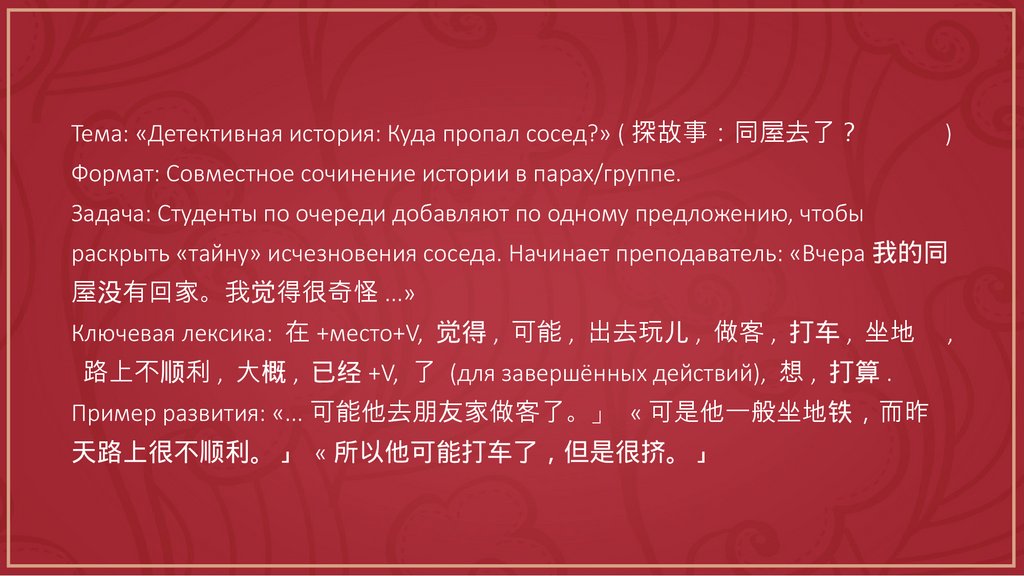 раскрыть «тайну» исчезновения соседа. Начинает преподаватель: «Вчера 我的同