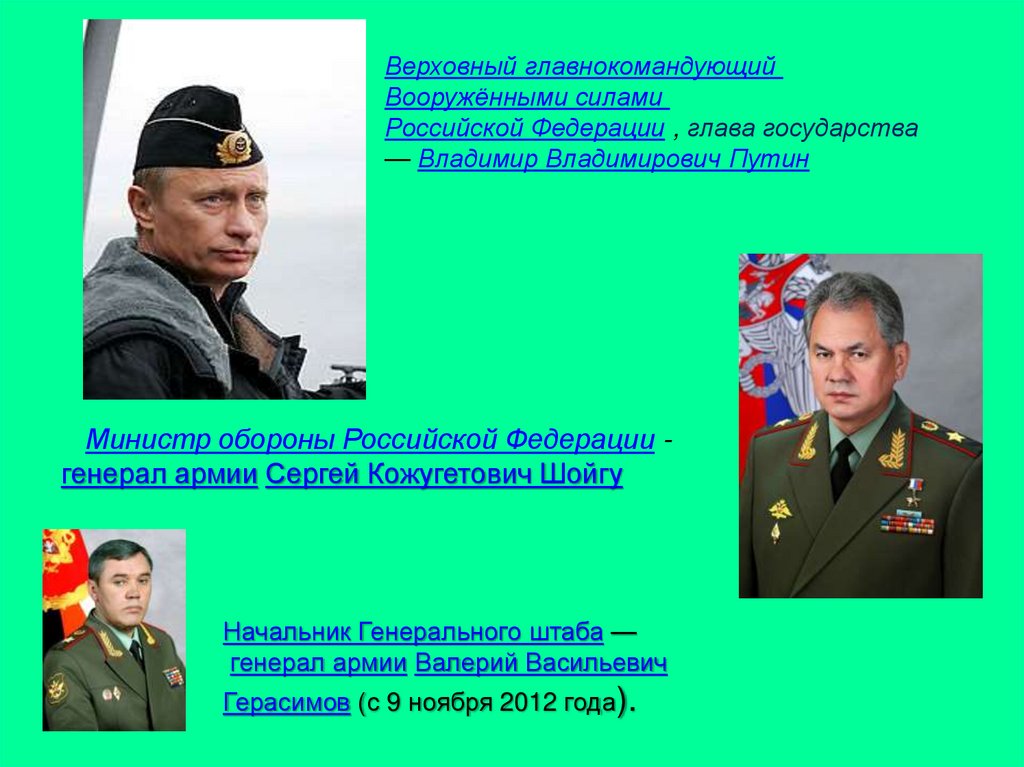 Президент РФ – Верховный главнокомандующий ВС РФМинистр обороны РФ