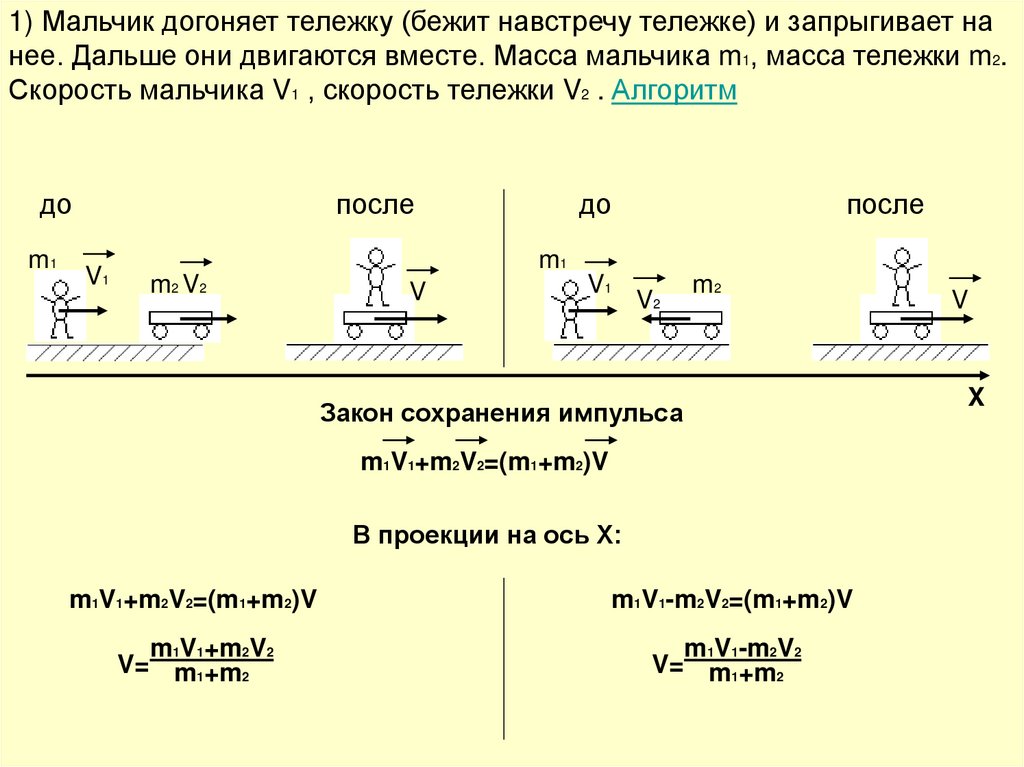 1) Мальчик догоняет тележку (бежит навстречу тележке) и запрыгивает нанее. Дальше они двигаются вместе. Масса мальчика m1, масса тележки m2.