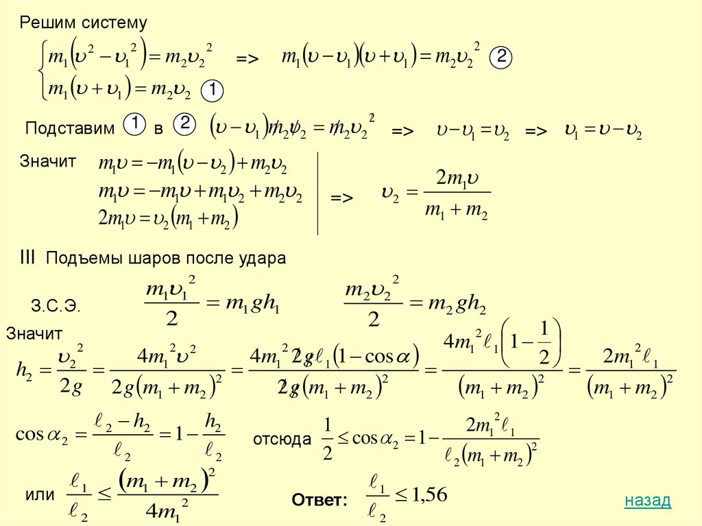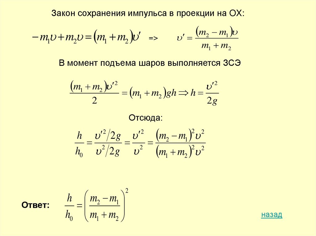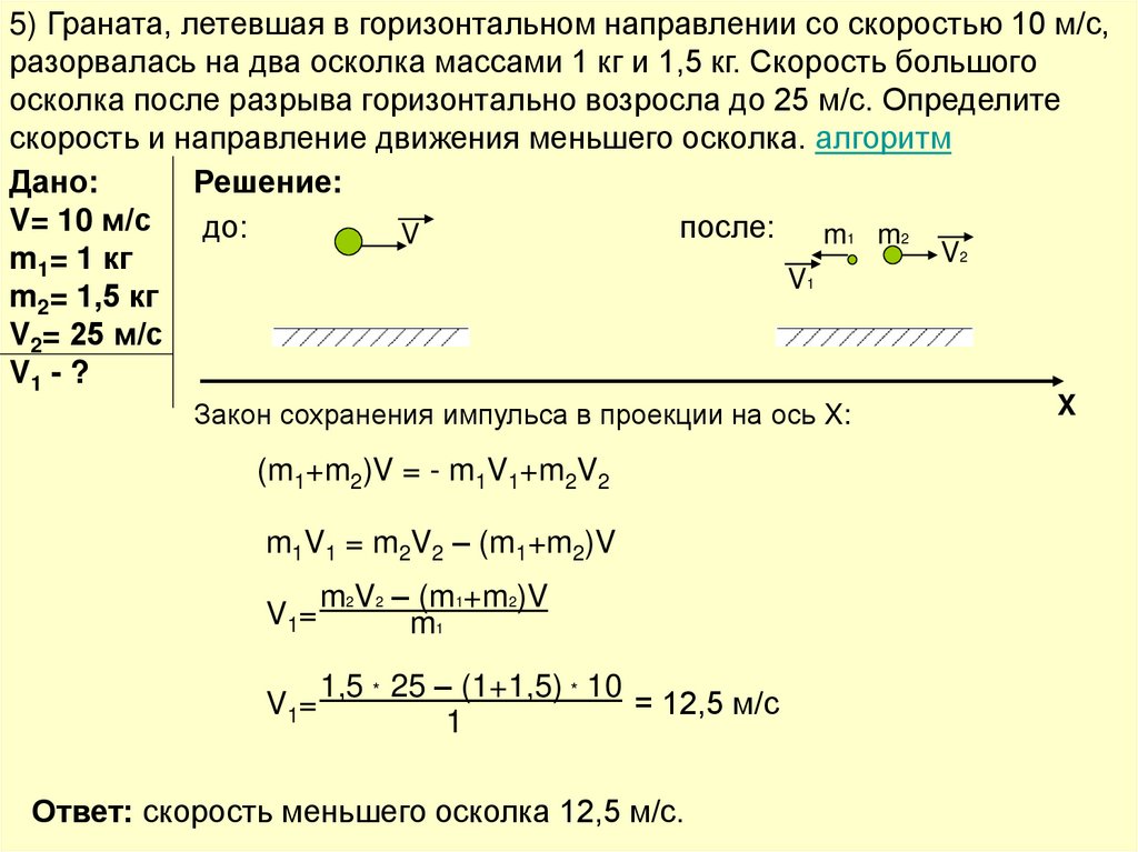 5) Запишите закон сохранения импульса (в проекции на выбранную ось)