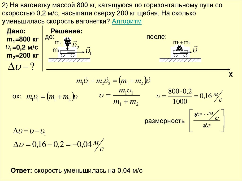 2) На вагонетку массой 800 кг, катящуюся по горизонтальному пути соскоростью 0,2 м/с, насыпали сверху 200 кг щебня. На сколько