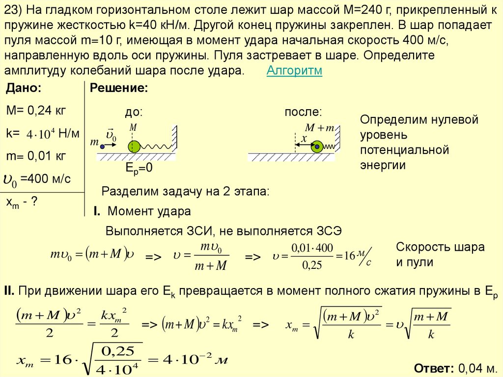23) На гладком горизонтальном столе лежит шар массой М=240 г, прикрепленный кпружине жесткостью k=40 кН/м. Другой конец пружины закреплен. В шар попадает