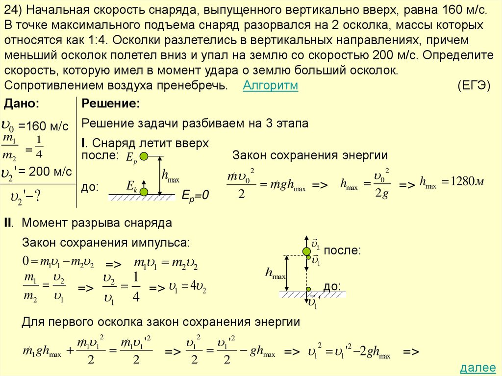 24) Начальная скорость снаряда, выпущенного вертикально вверх, равна 160 м/с.В точке максимального подъема снаряд разорвался на 2 осколка, массы которых