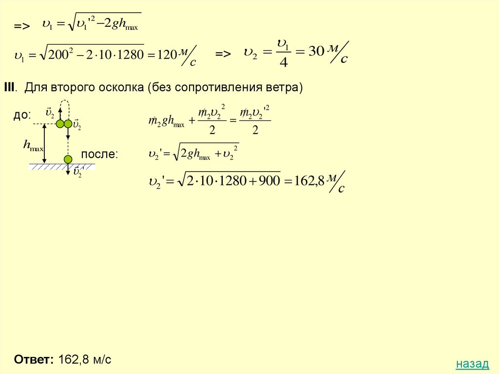 III. Для второго осколка (без сопротивления ветра)