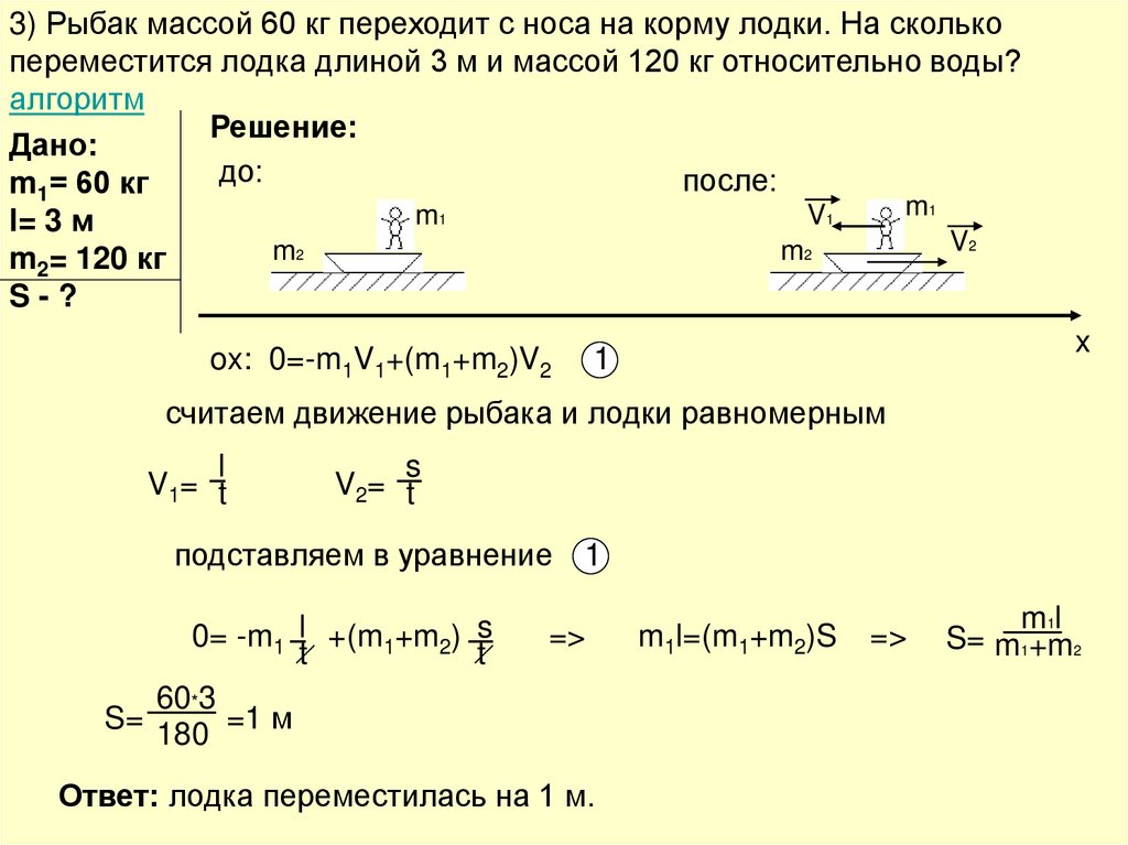 3) Рыбак массой 60 кг переходит с носа на корму лодки. На сколькопереместится лодка длиной 3 м и массой 120 кг относительно воды?