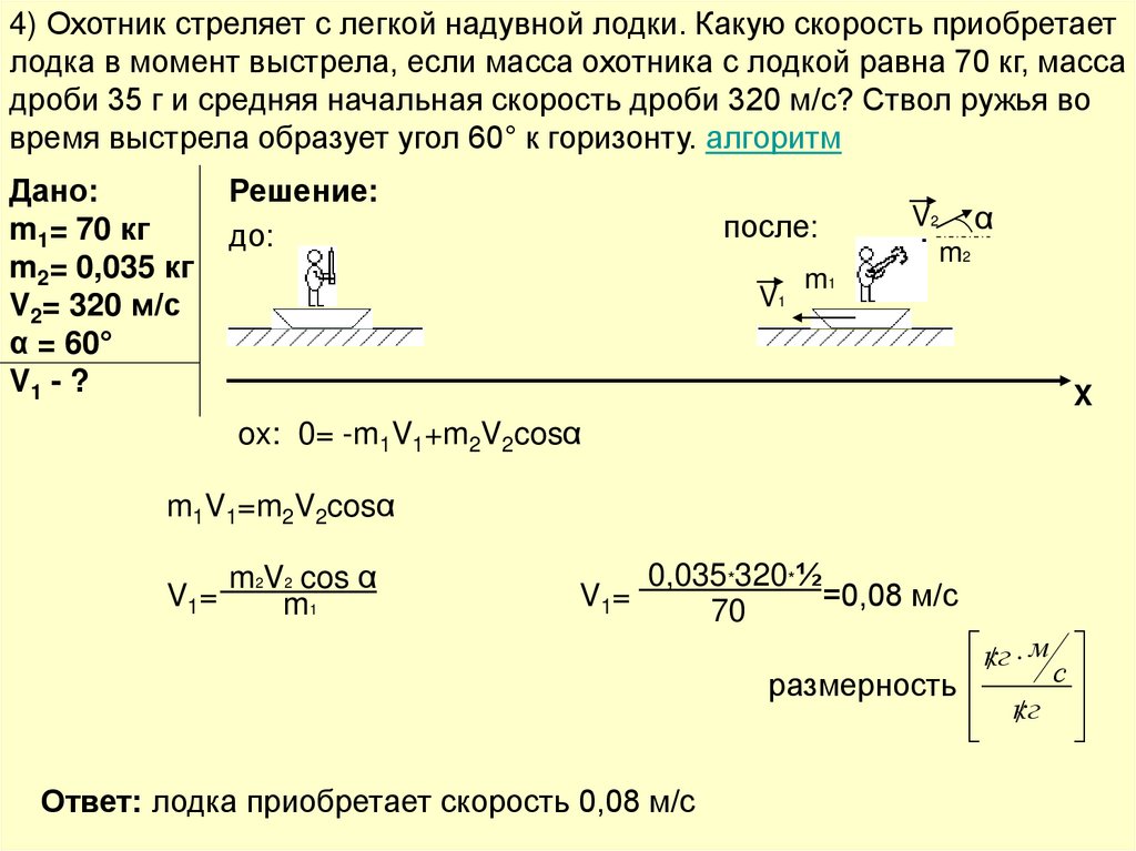 4) Охотник стреляет с легкой надувной лодки. Какую скорость приобретаетлодка в момент выстрела, если масса охотника с лодкой равна 70 кг, масса