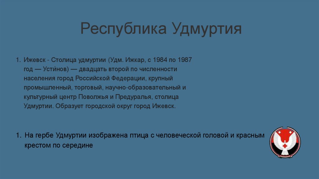 1. На гербе Удмуртии изображена птица с человеческой головой и красным