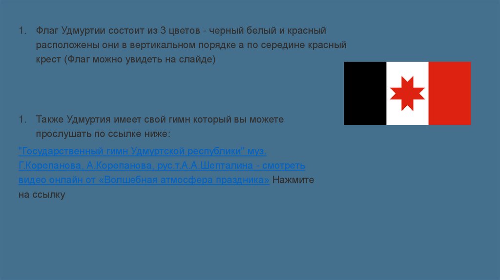 1. Флаг Удмуртии состоит из 3 цветов - черный белый и красныйрасположены они в вертикальном порядке а по середине красный