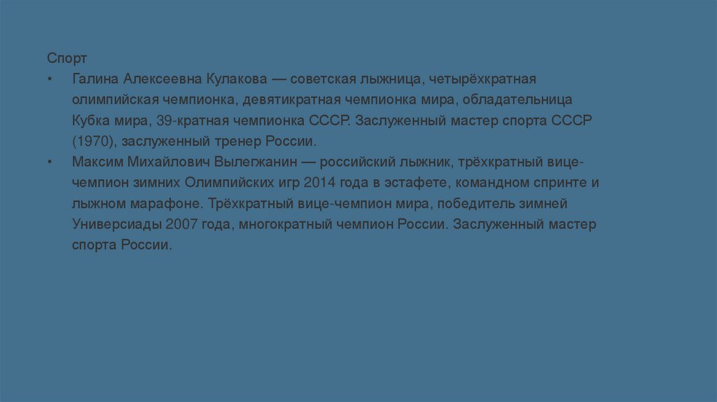 Спорт• Галина Алексеевна Кулакова — советская лыжница, четырёхкратная