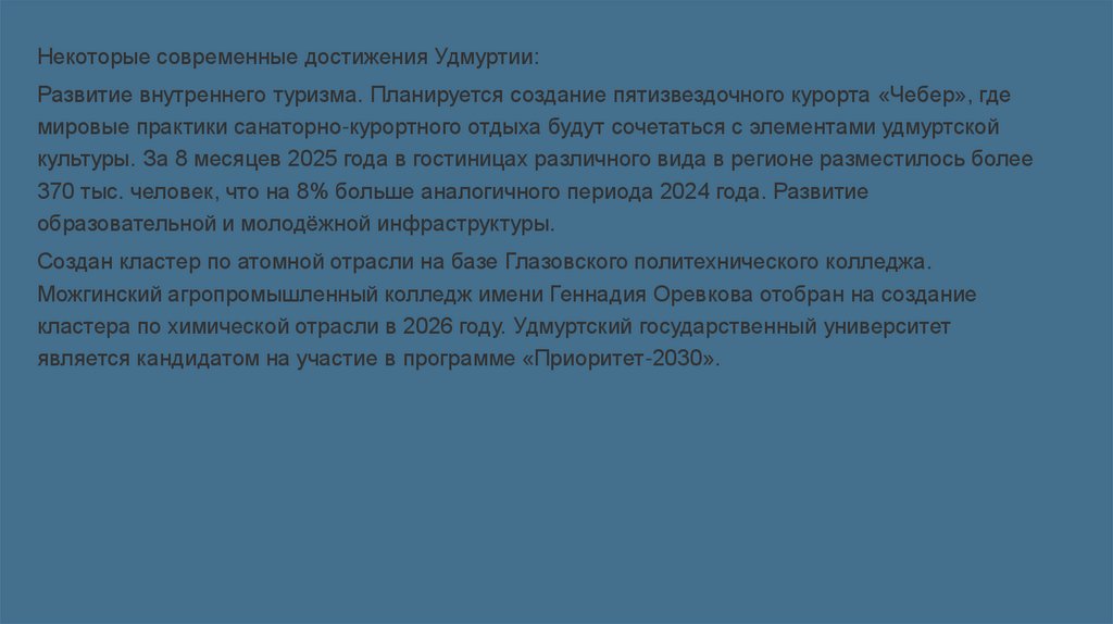 Некоторые современные достижения Удмуртии:Развитие внутреннего туризма. Планируется создание пятизвездочного курорта «Чебер», где