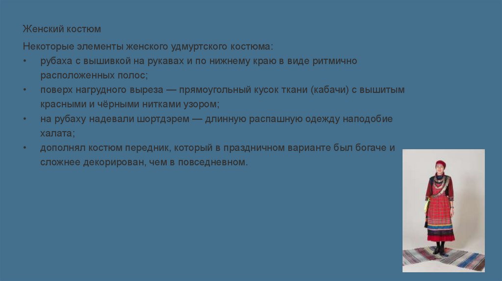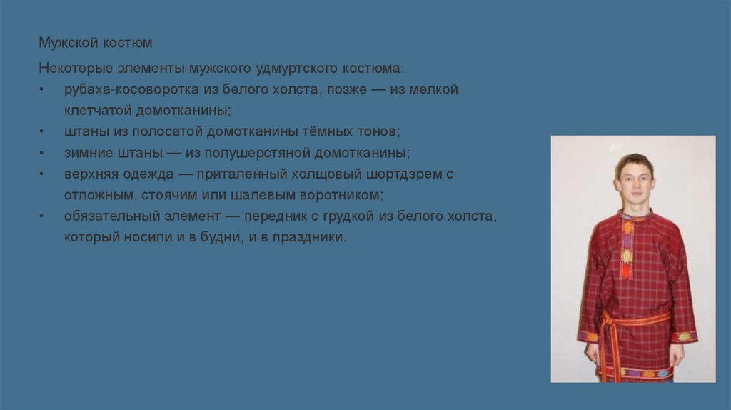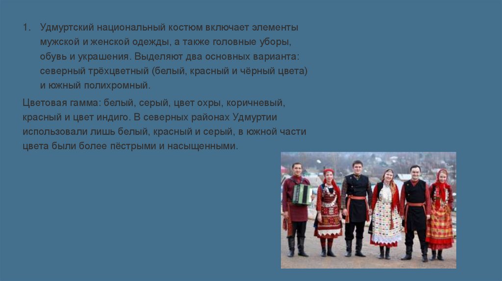 1. Удмуртский национальный костюм включает элементымужской и женской одежды, а также головные уборы,