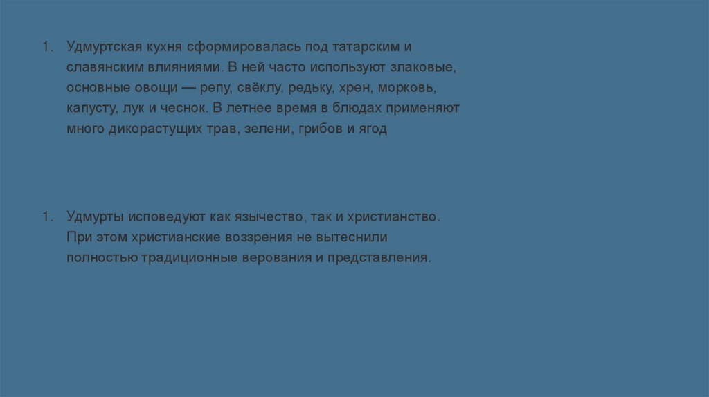 1. Удмуртская кухня сформировалась под татарским иславянским влияниями. В ней часто используют злаковые,