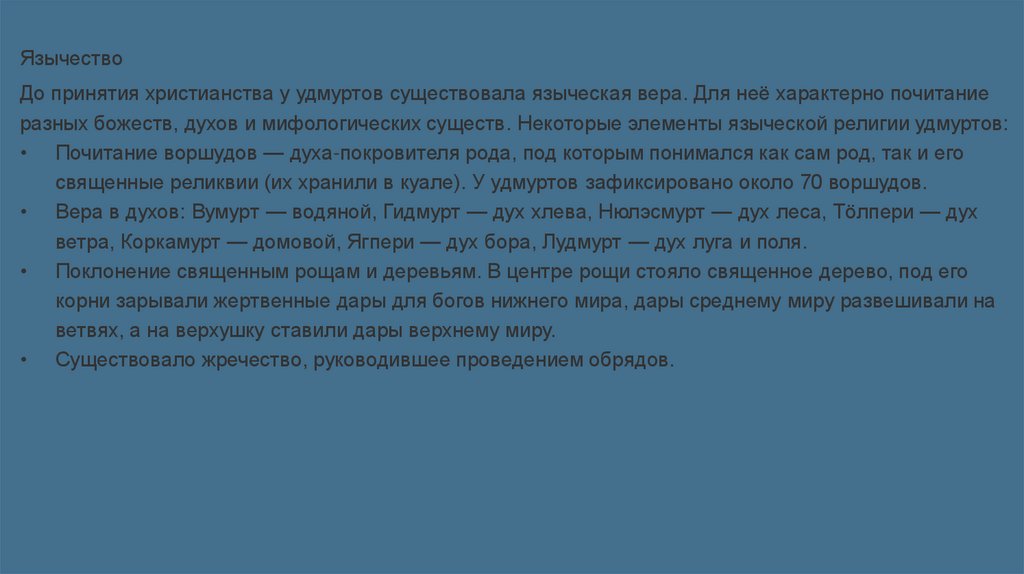 ЯзычествоДо принятия христианства у удмуртов существовала языческая вера. Для неё характерно почитание