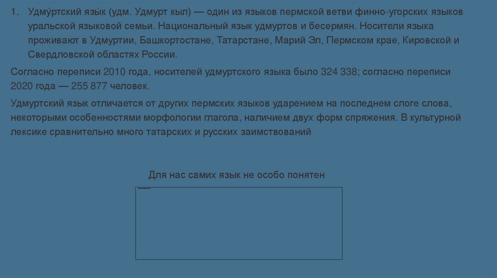 Удмуртский язык отличается от других пермских языков ударением на последнем слоге слова,