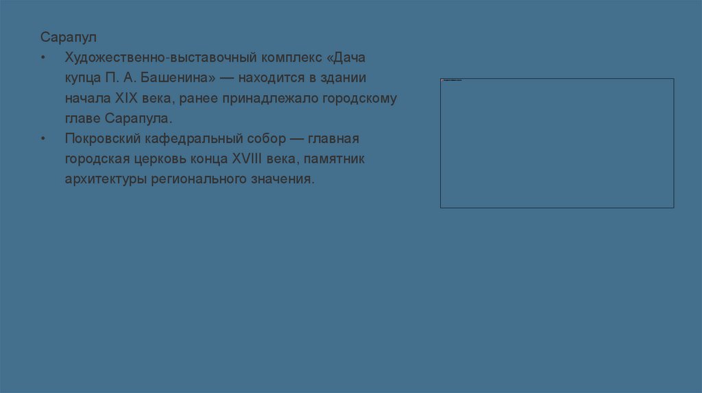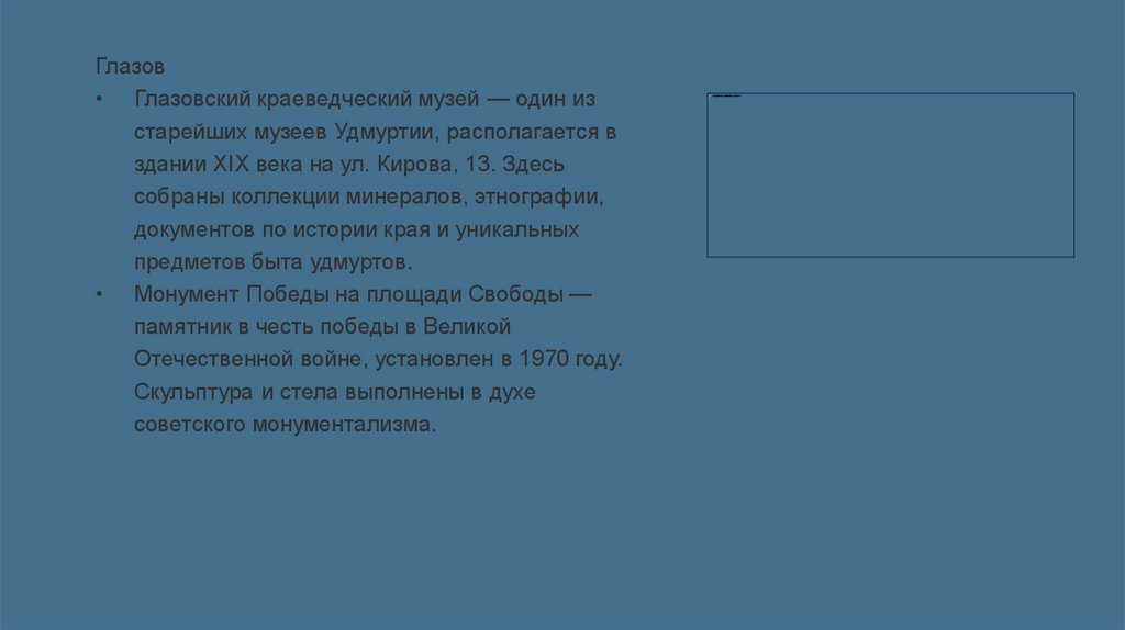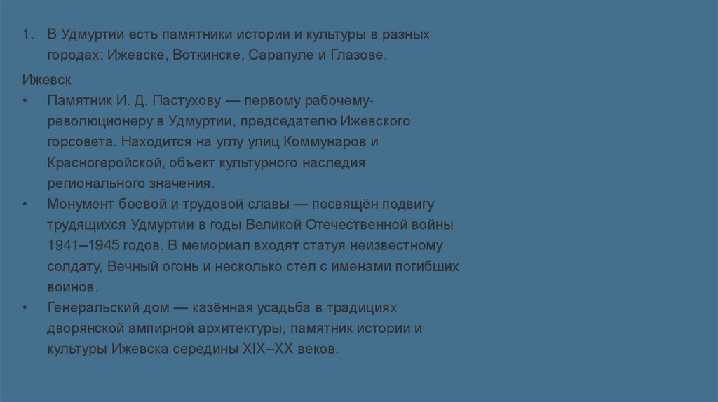 1. В Удмуртии есть памятники истории и культуры в разныхгородах: Ижевске, Воткинске, Сарапуле и Глазове.