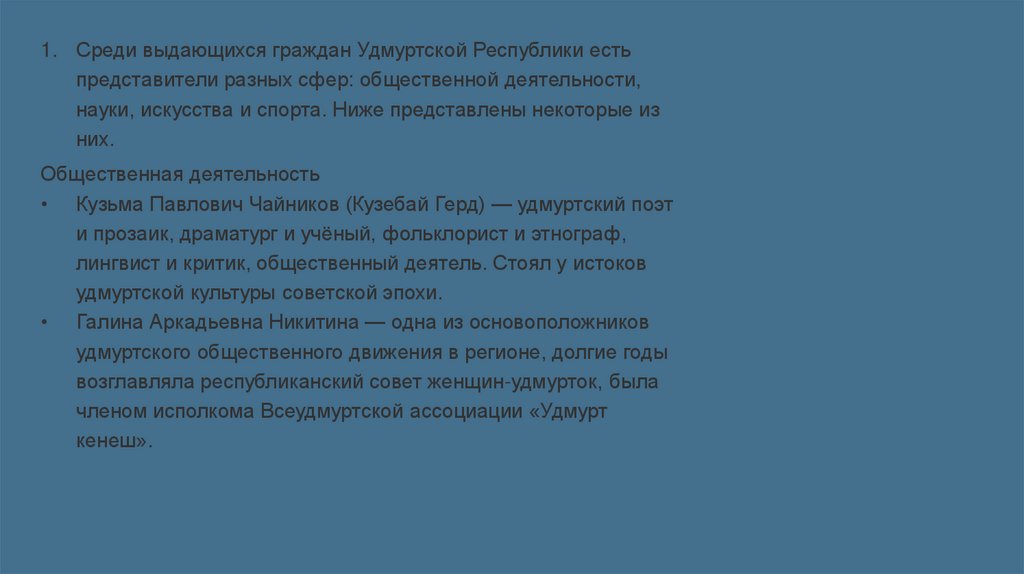 1. Среди выдающихся граждан Удмуртской Республики естьпредставители разных сфер: общественной деятельности,
