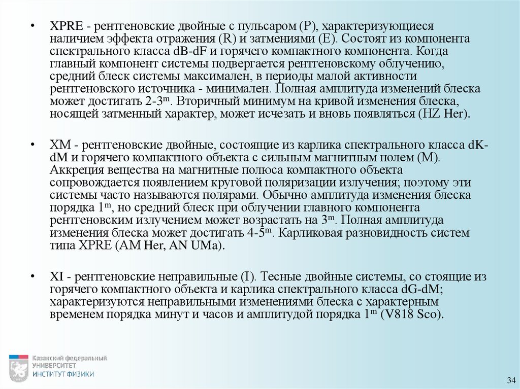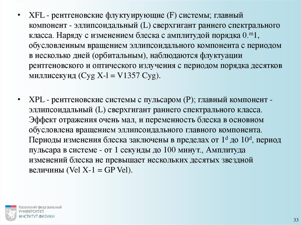 • XFL - рентгеновские флуктуирующие (F) системы; главныйкомпонент - эллипсоидальный (L) сверхгигант раннего спектрального