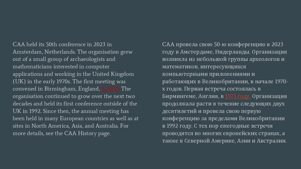 CAA held its 50th conference in 2023 inAmsterdam, Netherlands. The organisation grew