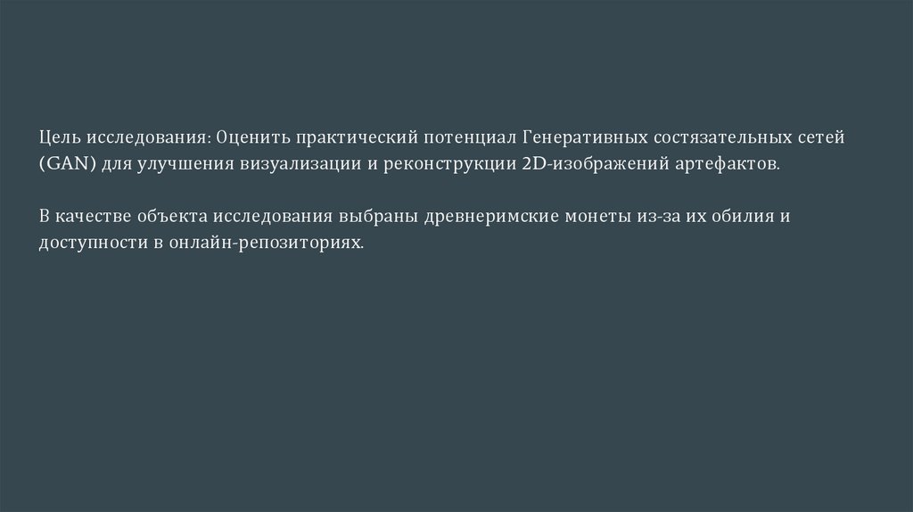 Цель исследования: Оценить практический потенциал Генеративных состязательных сетей(GAN) для улучшения визуализации и реконструкции 2D-изображений артефактов.
