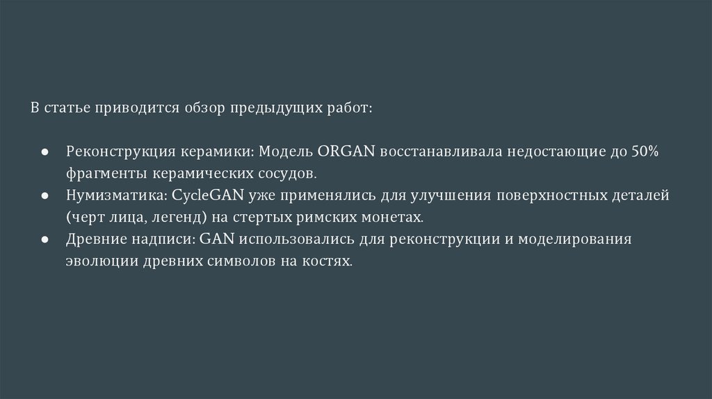 В статье приводится обзор предыдущих работ:Реконструкция керамики: Модель ORGAN восстанавливала недостающие до 50%