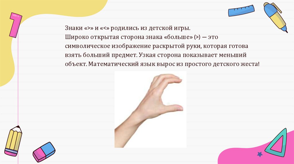 Знаки «>» и «<» родились из детской игры.Широко открытая сторона знака «больше» (>) — это