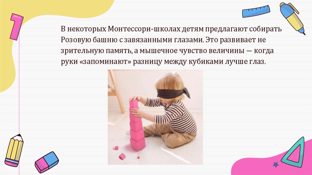 В некоторых Монтессори-школах детям предлагают собиратьРозовую башню с завязанными глазами. Это развивает не