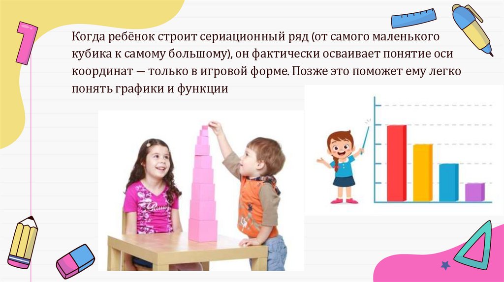 Когда ребёнок строит сериационный ряд (от самого маленькогокубика к самому большому), он фактически осваивает понятие оси