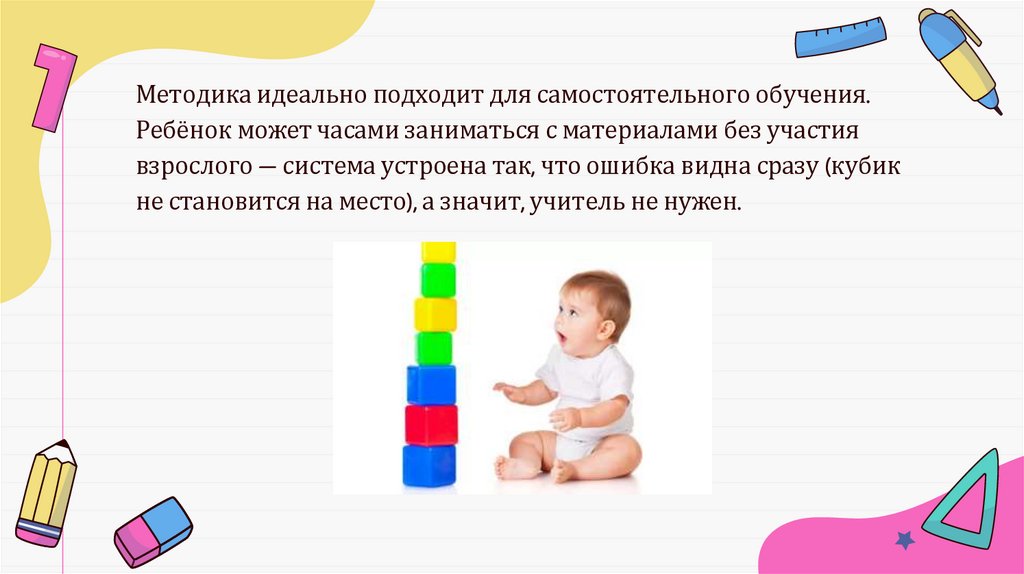 Методика идеально подходит для самостоятельного обучения.Ребёнок может часами заниматься с материалами без участия