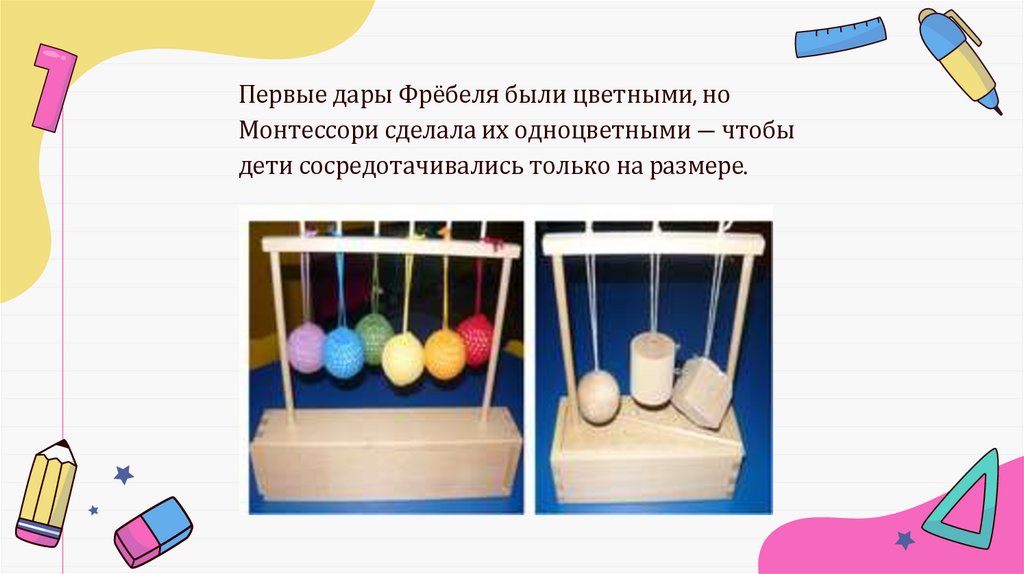 Первые дары Фрёбеля были цветными, ноМонтессори сделала их одноцветными — чтобы