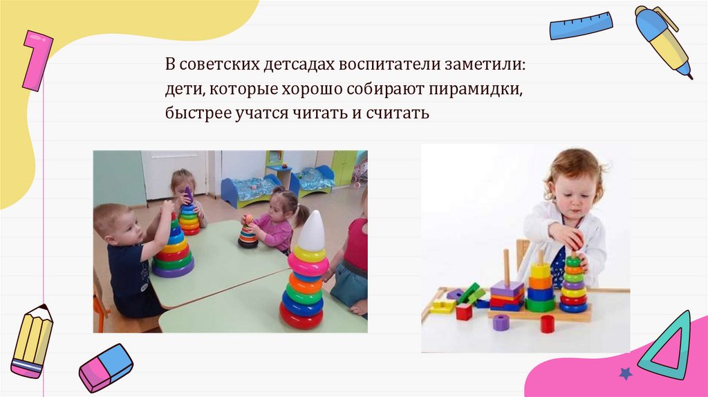 В советских детсадах воспитатели заметили:дети, которые хорошо собирают пирамидки,