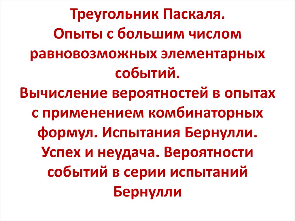 1. Треугольник Паскаля. Опыты с большим числом равновозможных элементарных событий. Вычисление вероятностей в опытах с применением
