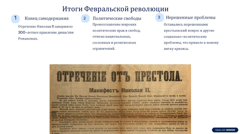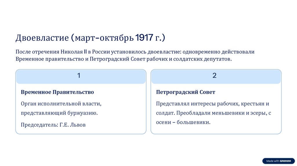 Двоевластие (март-октябрь 1917 г.)После отречения Николая II в России установилось двоевластие: одновременно действовали