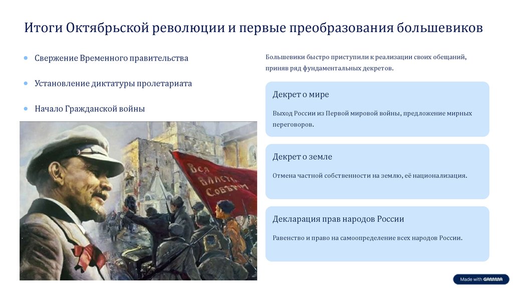 Итоги Октябрьской революции и первые преобразования большевиковСвержение Временного правительства