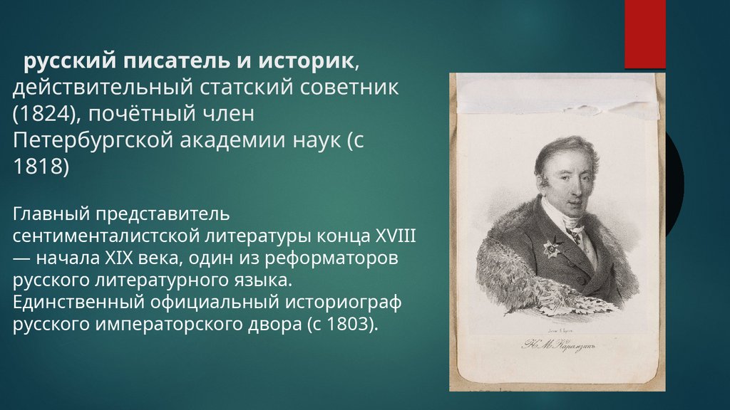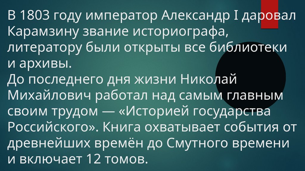 В 1803 году император Александр I даровалКарамзину звание историографа,