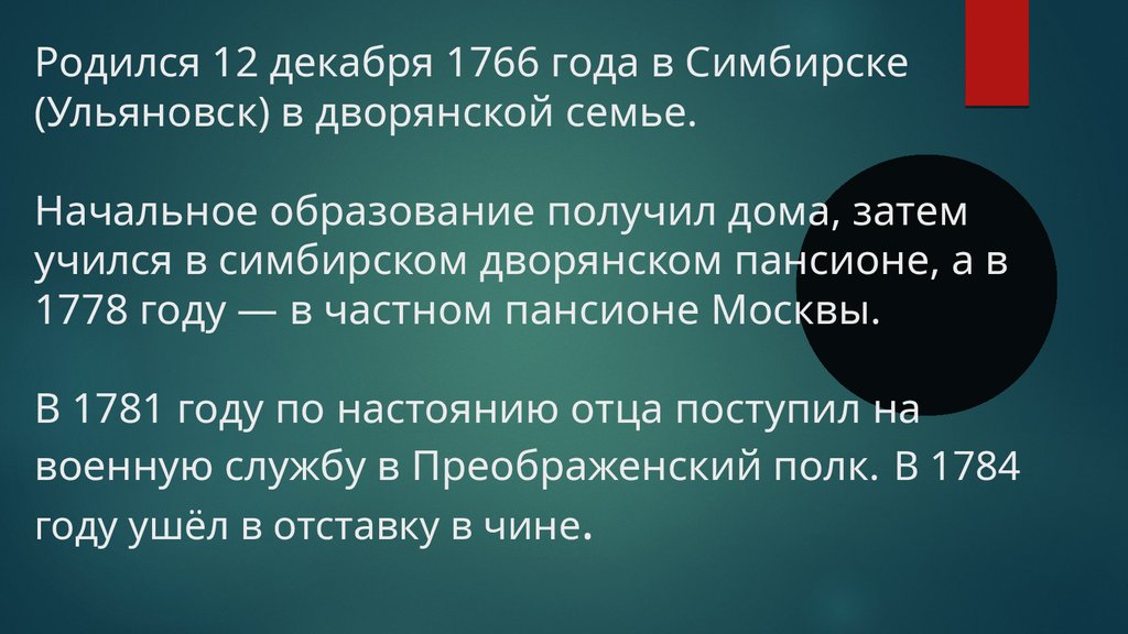 Родился 12 декабря 1766 года в Симбирске(Ульяновск) в дворянской семье.