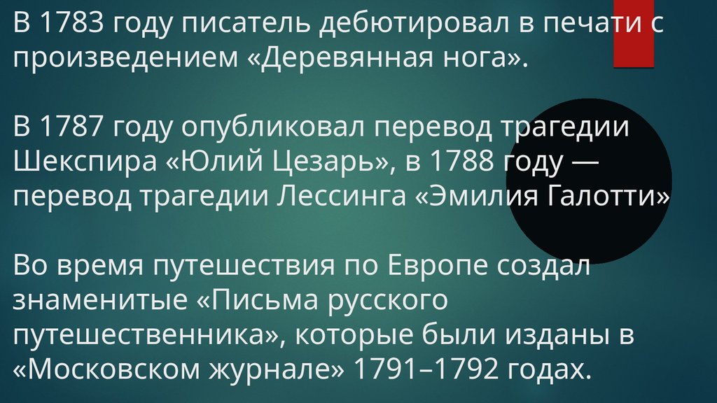В 1783 году писатель дебютировал в печати спроизведением «Деревянная нога».
