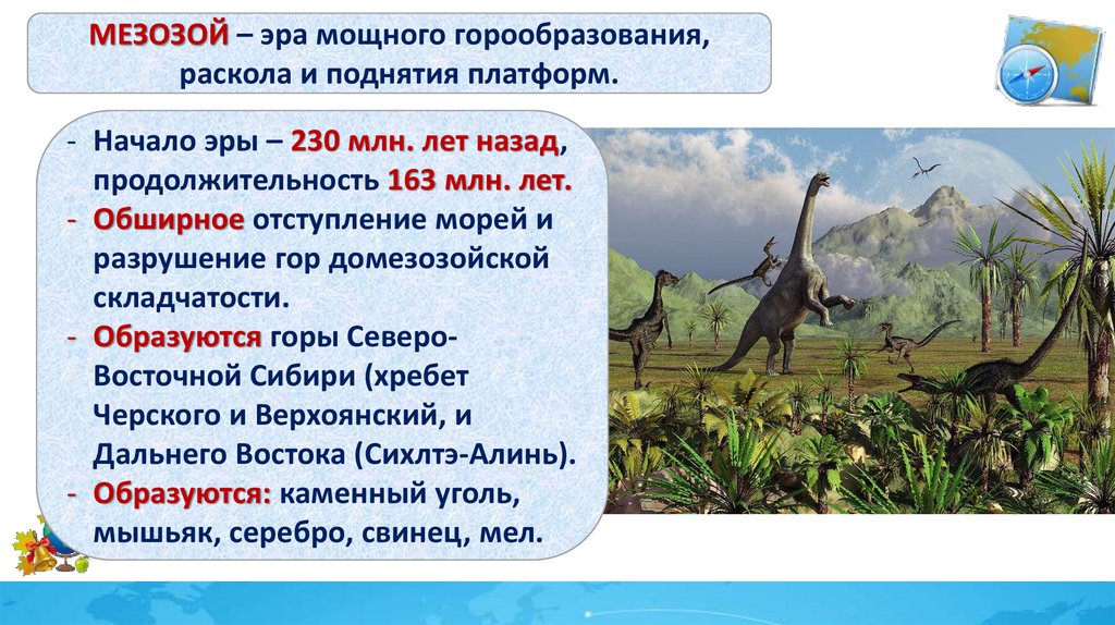 МЕЗОЗОЙ – эра мощного горообразования,раскола и поднятия платформ.