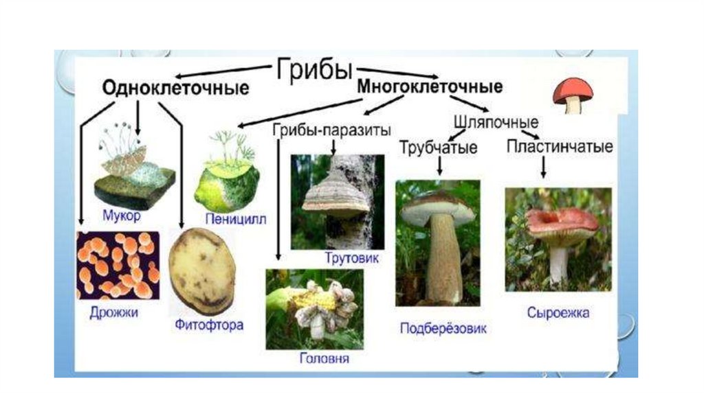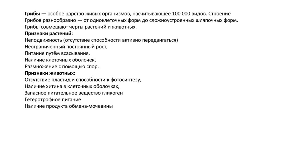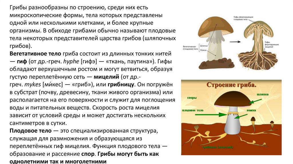 Грибы — особое царство живых организмов, насчитывающее 100 000 видов. СтроениеГрибов разнообразно — от одноклеточных форм до сложноустроенных шляпочных форм.