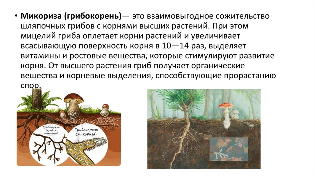 • Микориза (грибокорень)— это взаимовыгодное сожительствошляпочных грибов с корнями высших растений. При этом