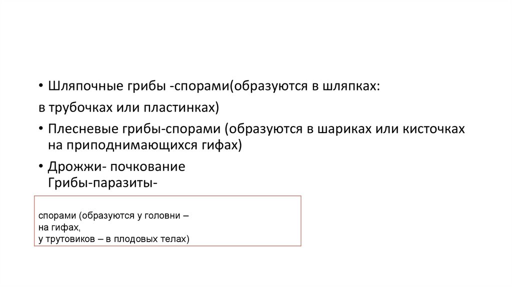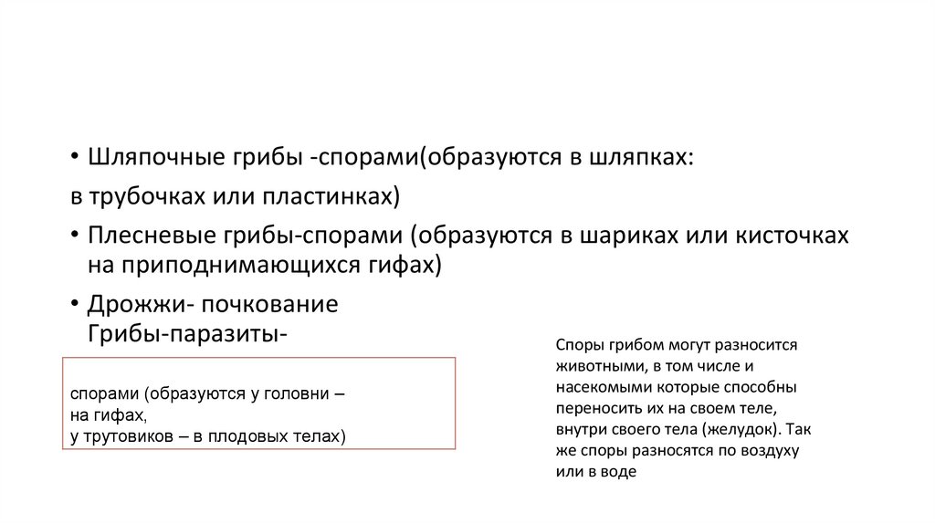• Шляпочные грибы -спорами(образуются в шляпках:в трубочках или пластинках)