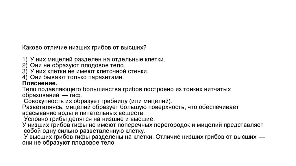 Каково отличие низших грибов от высших?1) У них мицелий разделен на отдельные клетки.