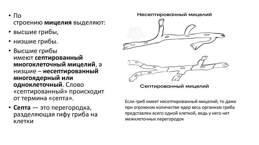 У высших грибов гифы разделены на клетки. Отличие низших грибов от высших —