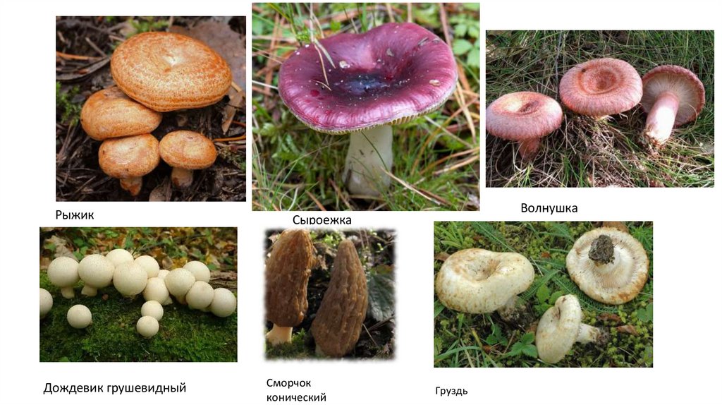 других из пластинок – пластинчатые грибы: рыжики, сыроежки, волнушки.