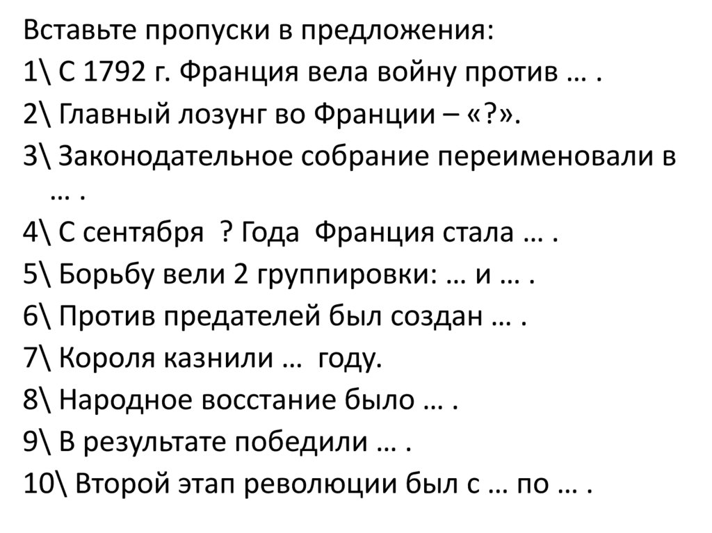 Вставьте пропуски в предложения:1\ С 1792 г. Франция вела войну против … .