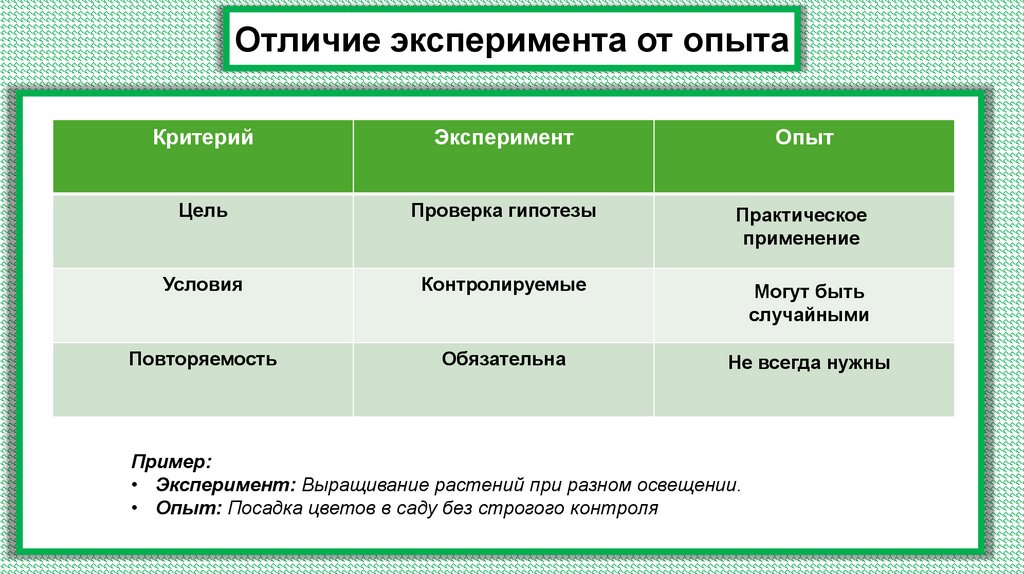 Отличие эксперимента от опытаКритерий